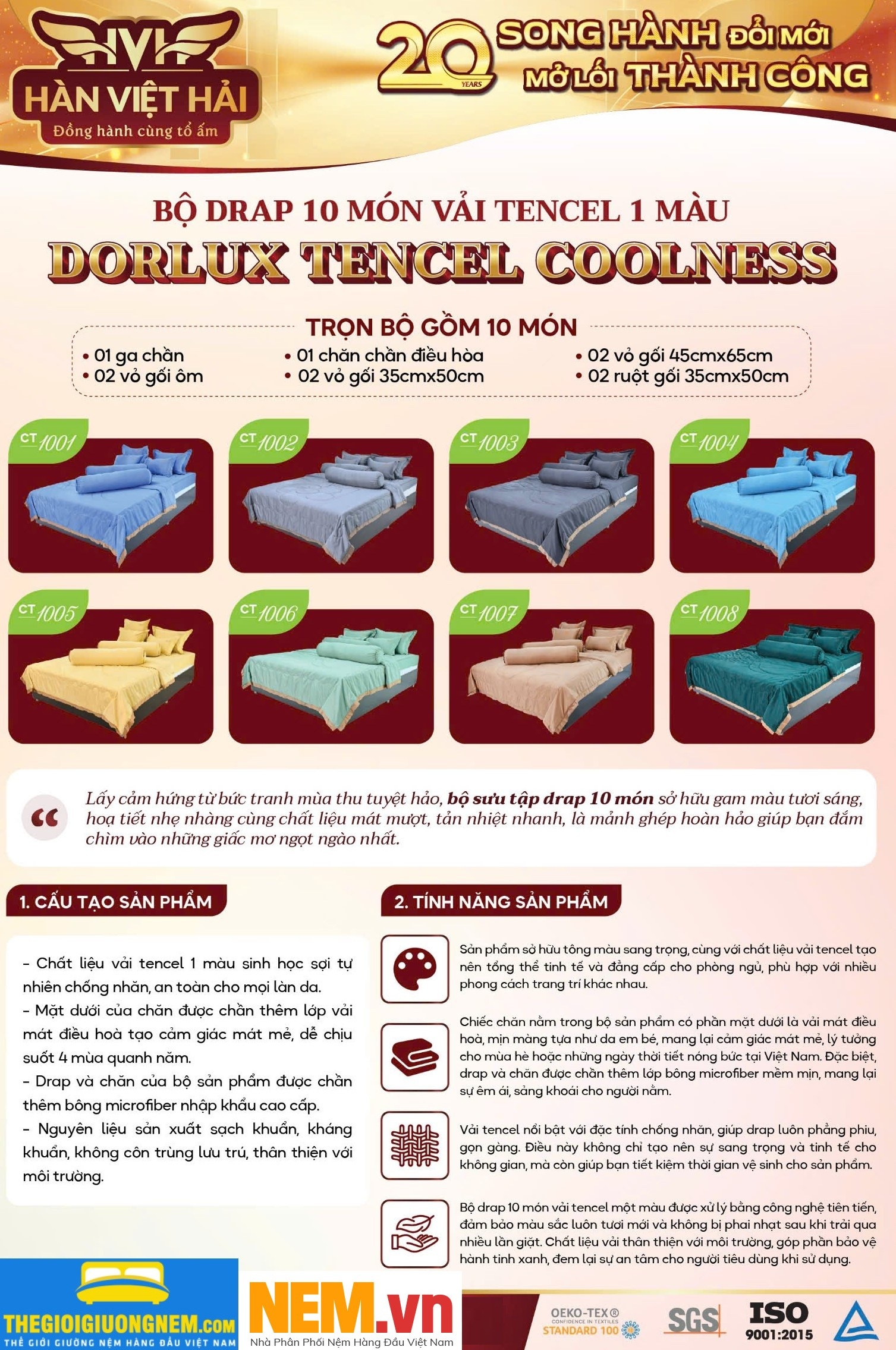 Bộ drap 10 món vải tencel một màu được xử lý bằng công nghệ tiên tiến, đảm bảo màu sắc luôn tươi mới và không bị phai nhạt sau khi trải qua nhiều lần giặt. Chất liệu vải thân thiện với môi trường, góp phần bảo vệ hành tinh xanh, đem lại sự an tâm cho người tiêu dùng khi sử dụng.