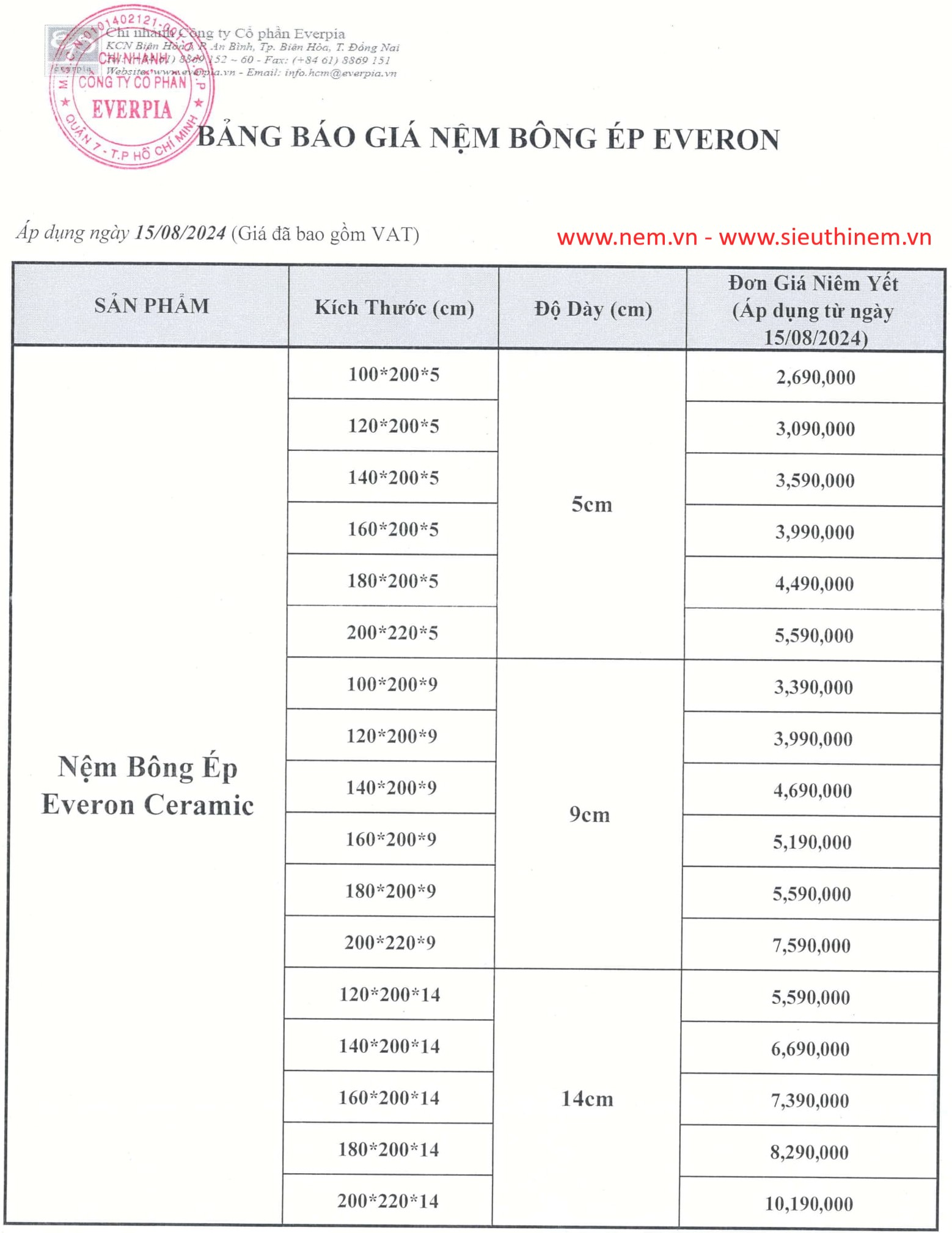 Bảng Giá Nệm Bông Ép Everon - Ceramic ( 21.08.2024 )