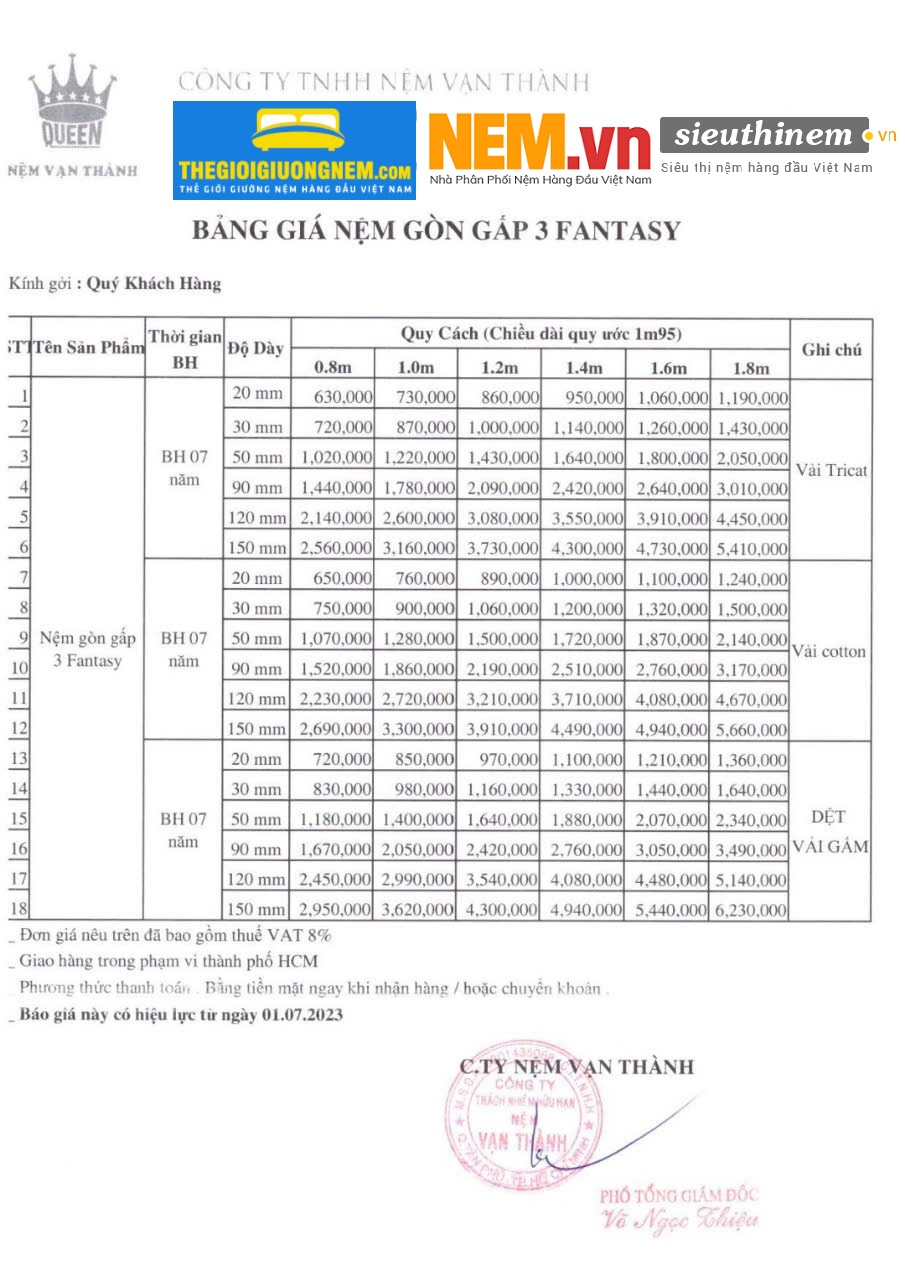 Bảng Giá Nệm Bông Ép Gấp 03 - Vạn Thành