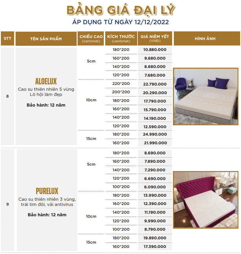 Bảng Giá Nệm Cao Su Kim Cương 5 Zone - Aloelux ( 08.03.2025 )