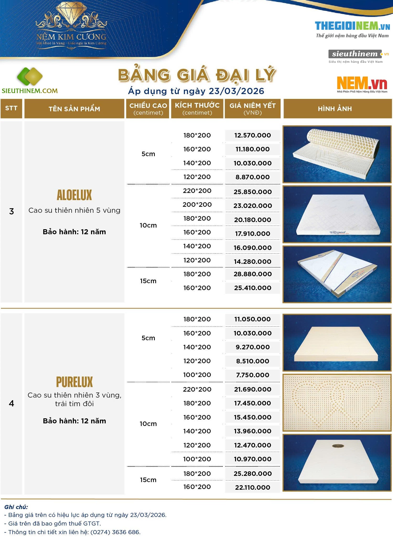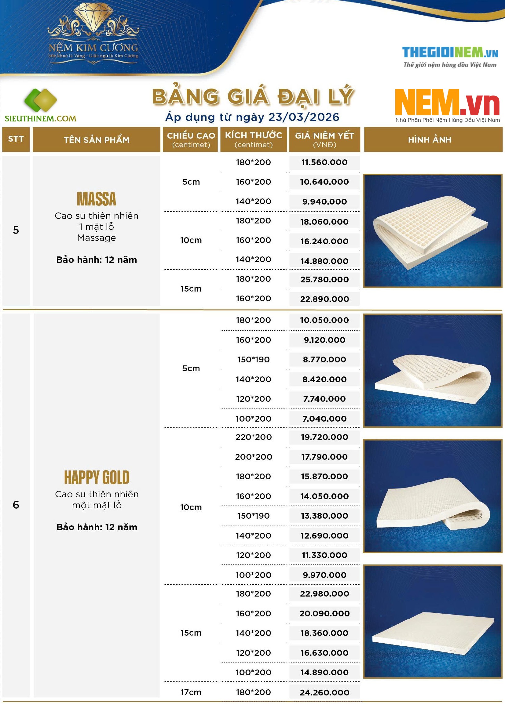 Nệm cao su thiên nhiên của thương hiệu Nệm Kim Cương được sản xuất từ 100% mủ cây cao su, không pha thêm hóa chất nên hoàn toàn an toàn cho sức khỏe người dùng. Sản phẩm nệm cao su được bảo hành 12 năm. Giá nệm cao su Kim Cương thấp hơn một số thương hiệu lớn khác như Liên Á, Vạn Thành..., với các dòng nệm chính như: Nệm cao su Kim Cương HappyGold, nệm cao su Kim Cương Diamond Luxury, nệm cao su Kim Cương Massage.