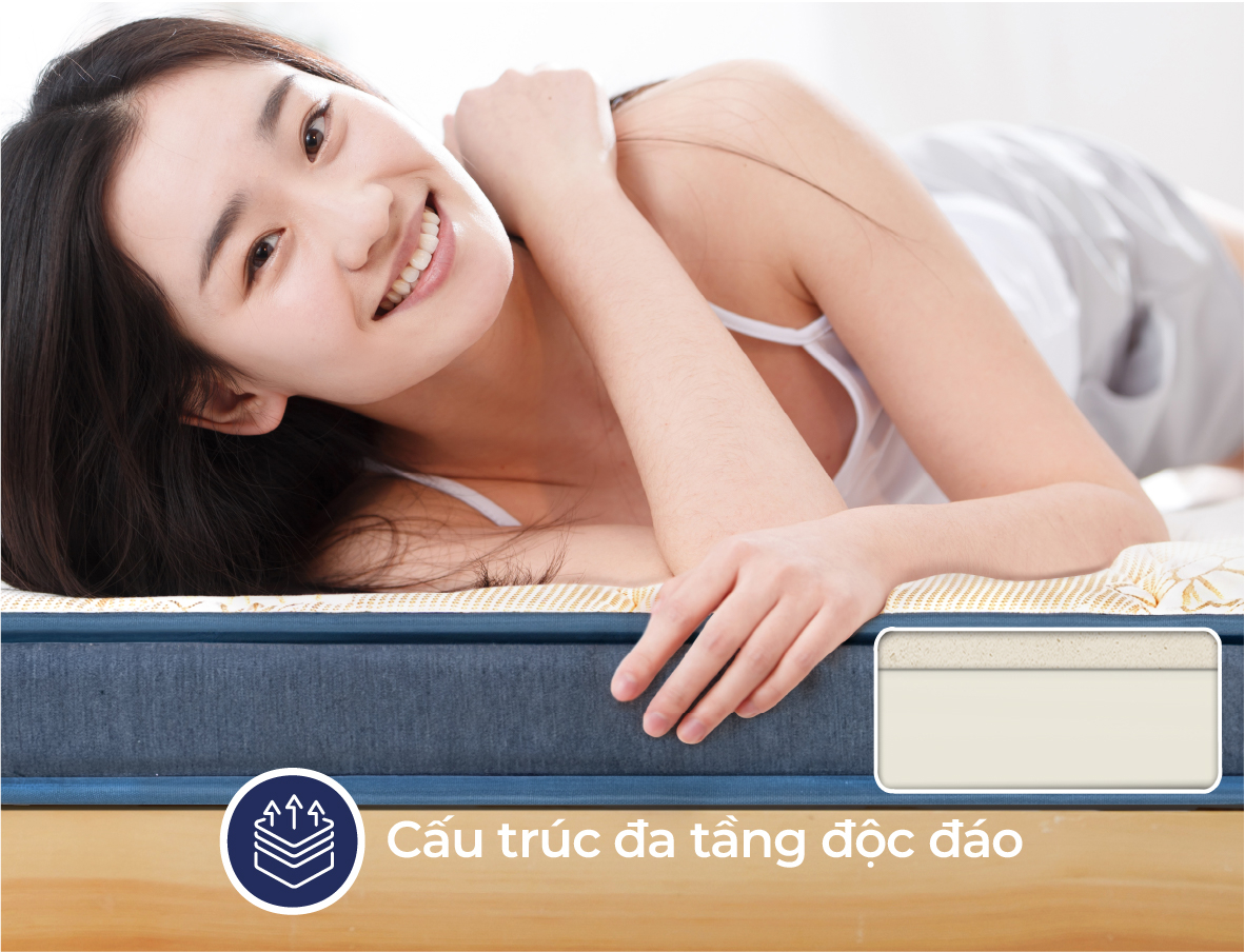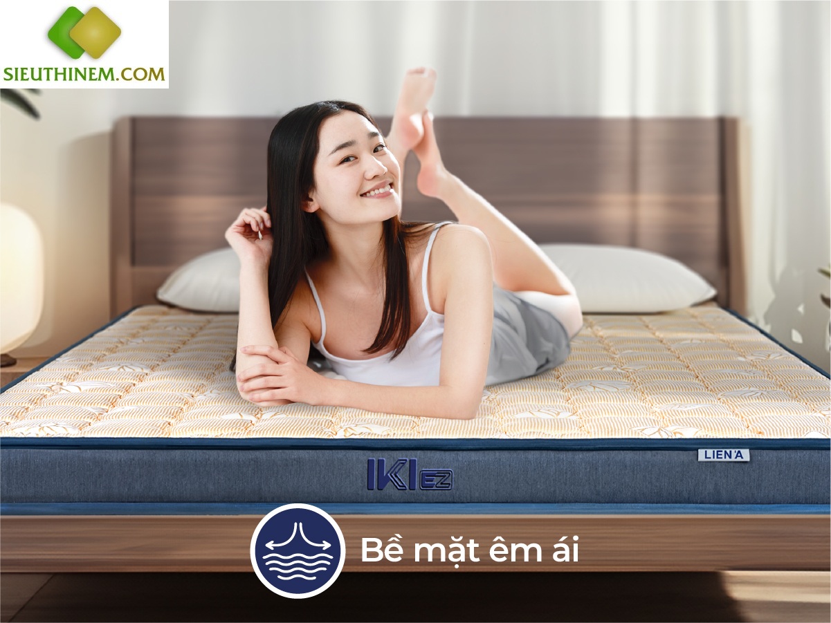 Nệm Liên Á IKI EZ được bổ sung lớp cao su thiên nhiên làm gia tăng cảm giác êm ái, độ đàn hồi tốt hỗ trợ ôm lấy mọi đường cong cơ thể. Trong khi đó, lớp foam cao cấp nằm ở đáy nệm giúp nâng đỡ vững chãi và hạn chế xẹp lún. Sự kết hợp chất liệu tạo nên sản phẩm chất lượng, chăm sóc giấc ngủ ngon trọn vẹn mỗi ngày.