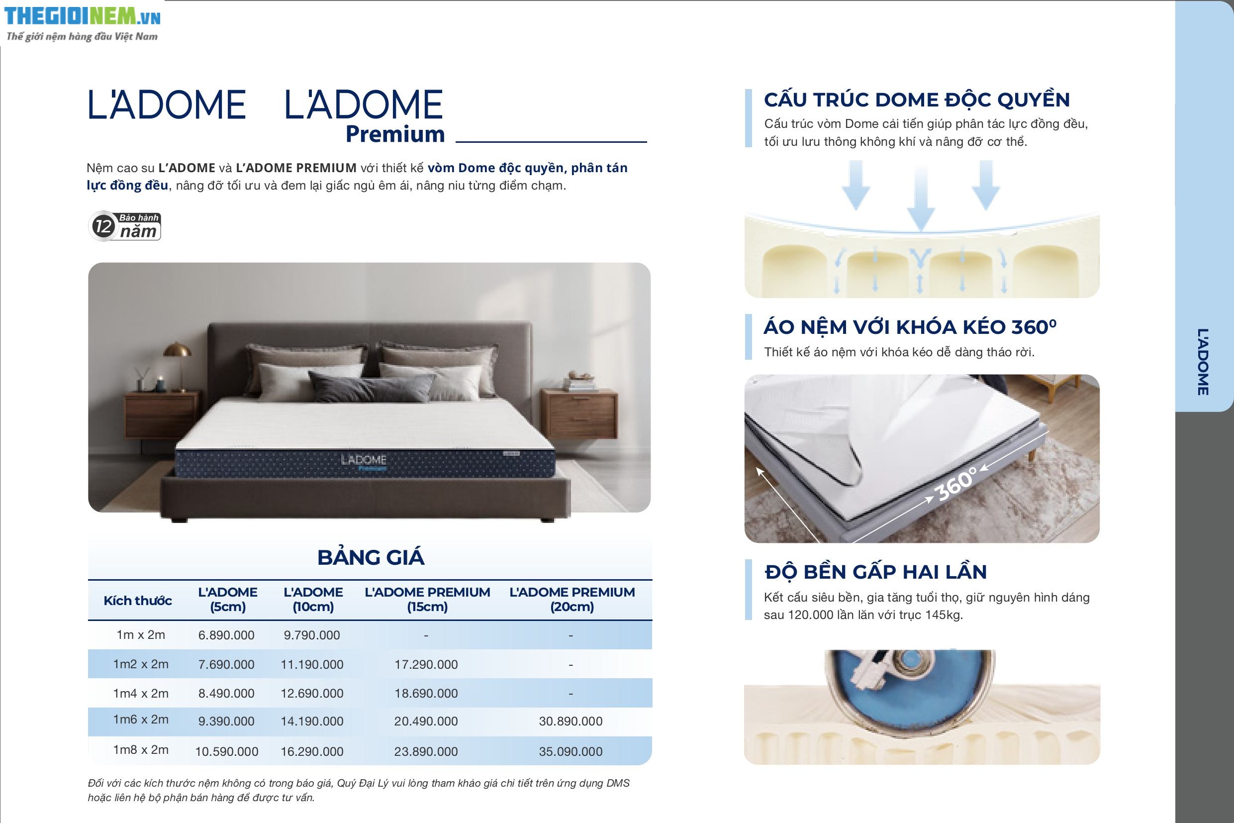 Nệm cao su Liên Á - L’ADOME là mẫu nệm cao su đầu tiên của Liên Á ứng dụng kết cấu mái vòm (DOME) vào việc định hình khối cao su cho nệm. Mặt dưới nệm thay vì bao gồm các lỗ vuông truyền thống, giờ đây sẽ là hệ thống lỗ tròn có thiết kế mái vòm. Khả năng chịu lực ưu việt của mái vòm sẽ tăng cường độ bật nảy và đàn hồi vốn có ở chất liệu cao su tự nhiên. Vì thế, nệm cao su L’ADOME được coi là sản phẩm dẫn đầu về độ bền, độ nâng đỡ và chịu lực. Điều đó có nghĩa là bạn sẽ thoải mái tận hưởng chiếc nệm êm dễ chịu của mình trong thời gian dài mà chất lượng vẫn như mới.