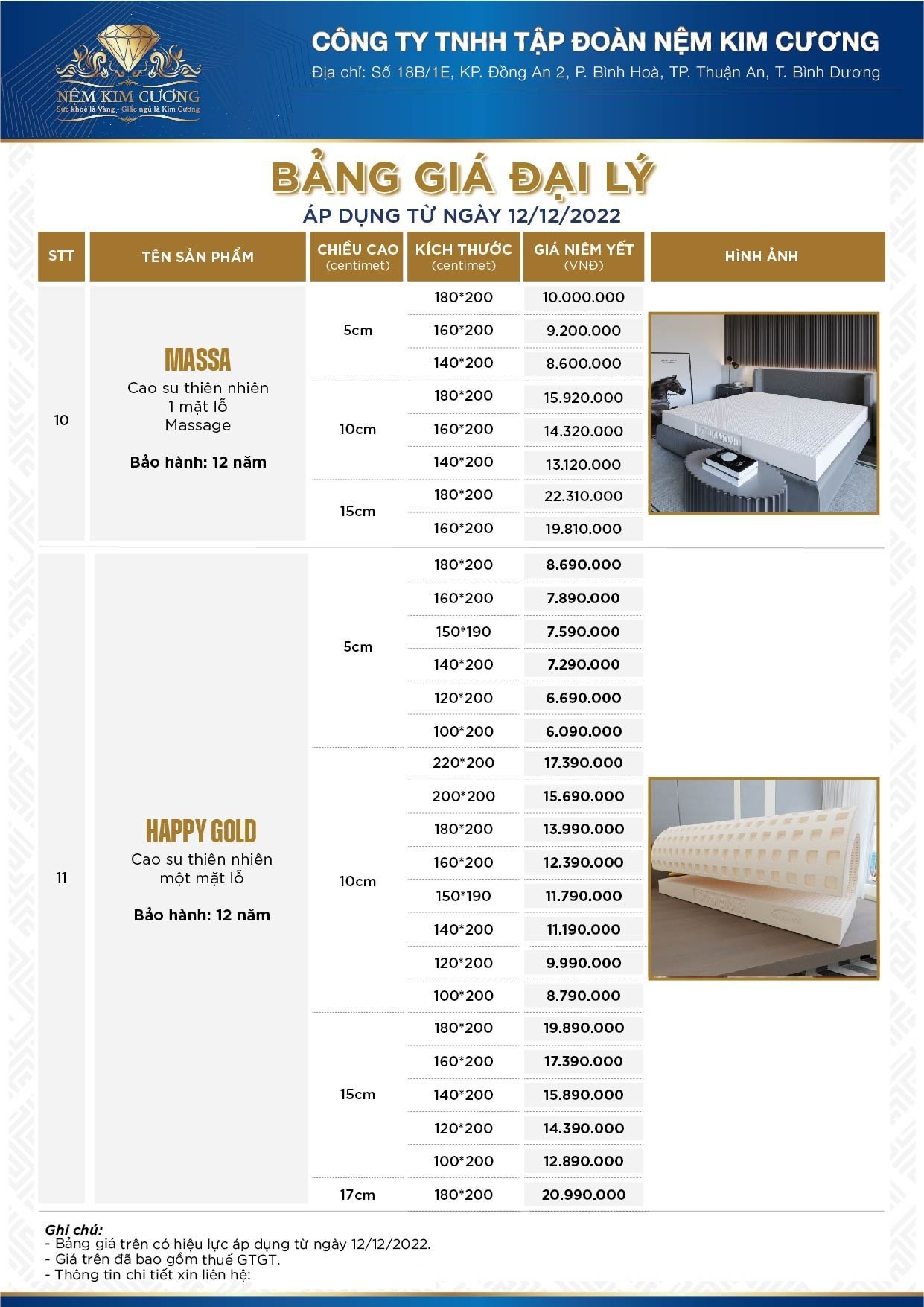 Bảng Giá Khuyến Mãi Nệm Cao Su Thiên Nhiên Kim Cương Happy Gold ( 22/02/2025 )
