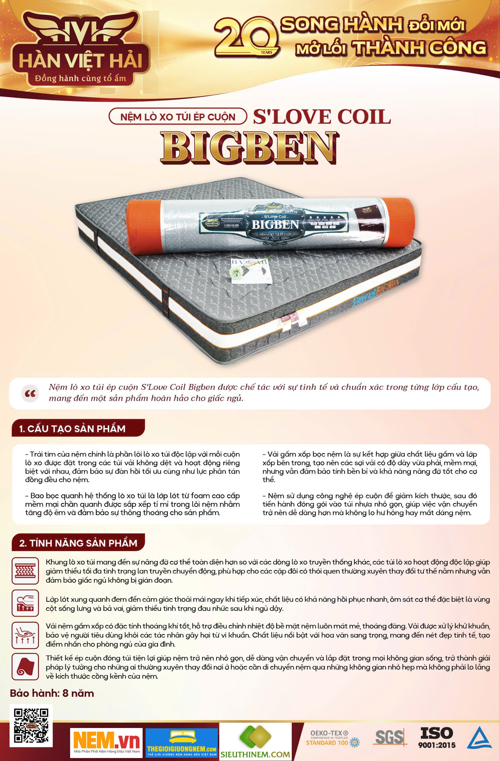 Nệm lò xo túi ép cuộn S’Love Coil Bigbenđược chế tác với sự tinh tế và chuẩn xác trong từng lớp cấu tạo, mang đến một sản phẩm hoàn hảo cho giấc ngủ.