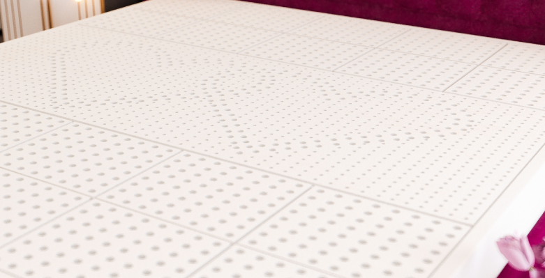 Nệm bố trí hệ thống lỗ thoáng khí kép đôi lưu trên dưới (mặt lỗ tròn phía trên, mặt lỗ vuông lớn phía dưới).