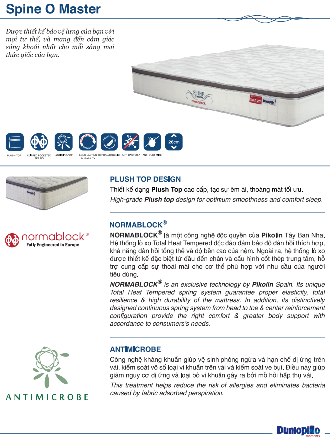 Nệm Lò Xo Normablock Dunlopillo Spine O Master được thiết kế để bảo vệ lưng của bạn với mọi tư thế ngủ, và mang đến cảm giác sảng khoái nhất cho mỗi sáng mai thức giấc của bạn