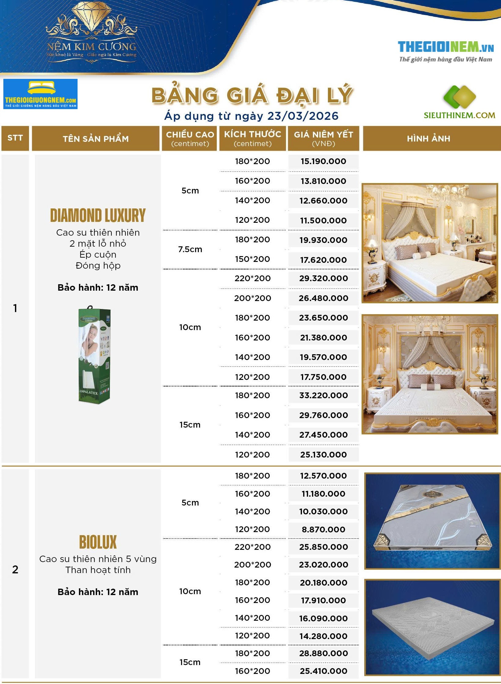 Nệm cao su thiên nhiên của thương hiệu Nệm Kim Cương được sản xuất từ 100% mủ cây cao su, không pha thêm hóa chất nên hoàn toàn an toàn cho sức khỏe người dùng. Sản phẩm nệm cao su được bảo hành 12 năm. Giá nệm cao su Kim Cương thấp hơn một số thương hiệu lớn khác như Vạn Thành, Liên Á..., với các dòng nệm chính như: Nệm cao su Kim Cương HappyGold, nệm cao su Kim Cương Diamond Luxury, nệm cao su Kim Cương Massage.